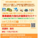 2025年11月11日 / 最終更新日時 : 2025年11月11日 益城町商工会 講習会 事業継続力強化計画セミナー(12/4)のお知らせ 事業継続力強化計画の理解を深め、自然災害や緊急時にも対応できる企業づくりを支援するためのセミナーを開催します。本セミナーでは計画策定の基本や実践的な対応策について具体例を交えながら解説します。災害対策や事業の安定運営をお […]