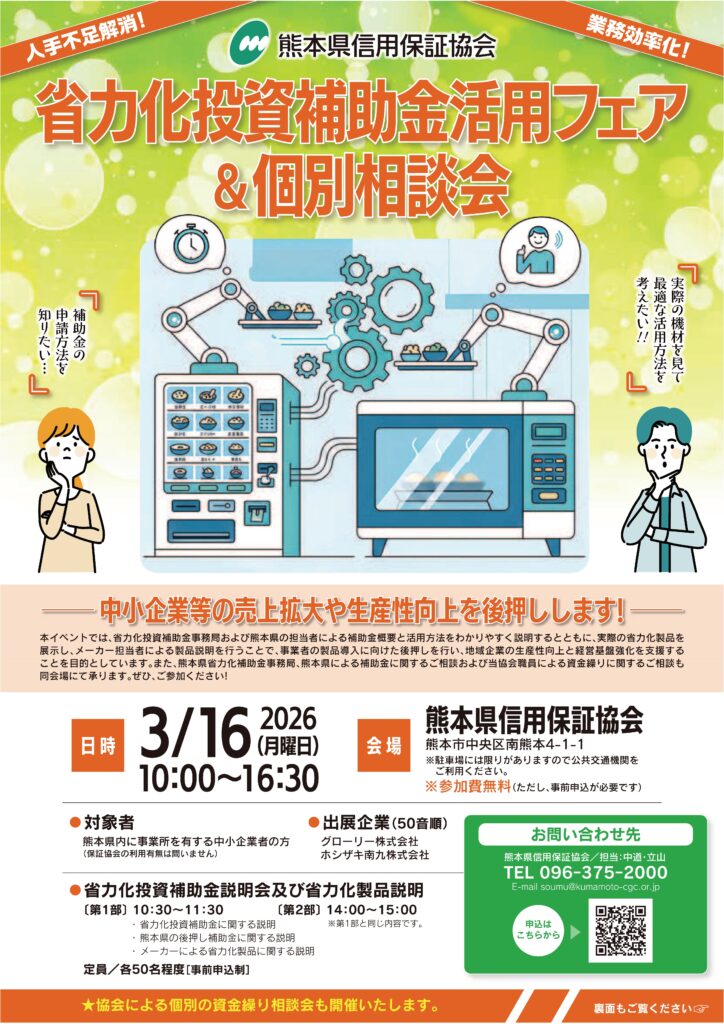 本イベントでは、省力化投資補助金事務局および熊本県の担当者による補助金概要と活用方法をわかりやすく説明するとともに、実際の省力化製品を展示し、メーカー担当者による製品説明を行うことで、事業者の製品導入に向けた後押しを行い、地域企業の生産性向上と経営基盤強化を支援することを目的として開催されます。また、熊本県省力化補助金事務局、熊本県による補助金に関するご相談および当協会職員による資金繰りに関するご相談も同会場にて承ります。ぜひ、ご参加ください!